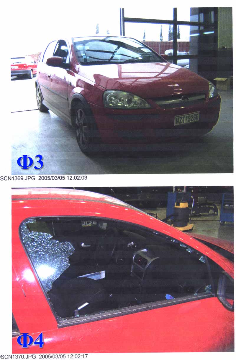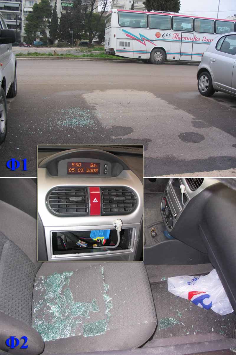 · Το πρωί της 5-3-2005 βρήκα σπασμένο το τζάμι του συνοδηγού και κλεμμένο το ραδιο-cd (Φ1-Φ2). Την ίδια μέρα επισκεύασα τη φθορά (Φ3-Φ4). |