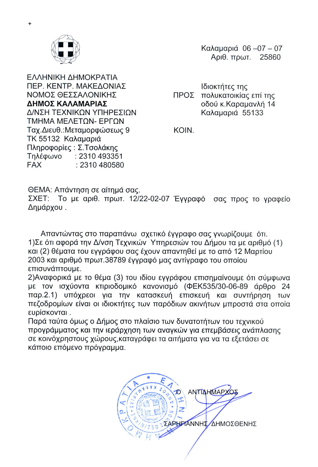 εύρισκε». Η επιστολή του κοινοποιήθηκε με φαξ (στο 2310480580) στις 3-7-07. Για να δοθεί η εντολή του Δημάρχου να απαντηθεί