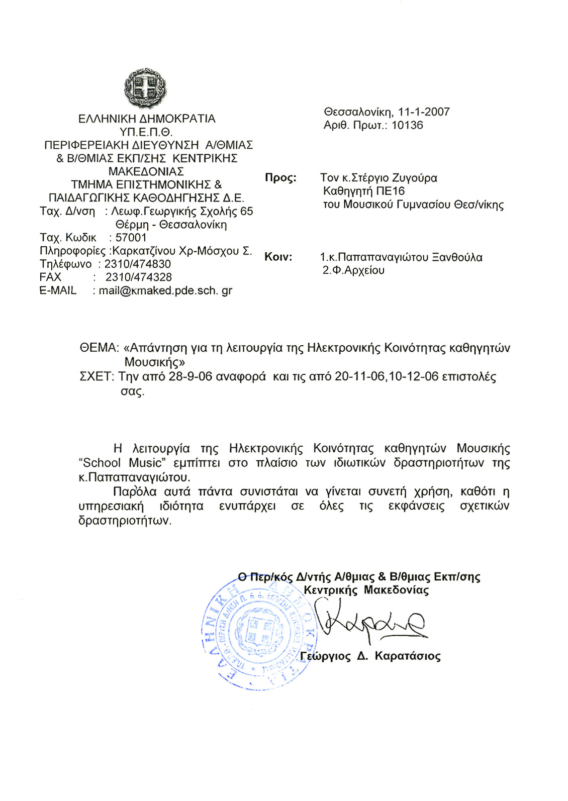Θεσσαλονίκη 11-1-2007 Αρ. Πρωτ. 10136 ΘΕΜΑ: «Απάντηση για τη λειτουργία της Ηλεκτρονικής Κοινότητας καθηγητών Μουσικής» ΣΧΕΤ: Την από 28-9-06 αναφορά και τις από 20-11-06, 10-12-06 επιστολές σας Η λειτουργία της Ηλεκτρονικής Κοινότητας καθηγητών Μουσικής “School Music” εμπίπτει στο πλαίσιο των ιδιωτικών δραστηριοτήτων της κ. Παπαπαναγιώτου. Παρ’ όλα αυτά πάντα συνιστάται να γίνεται συνετή χρήση, καθότι η υπηρεσιακή ιδιότητα ενυπάρχει σε όλες τις εκφάνσεις σχετικών δραστηριοτήτων. Ο Περ/κός Δ/ντής Α/θμιας & Β/θμιας Εκπ/σης Κεντρικής Μακεδονίας Γεώργιος Δ. Καρατάσιος |